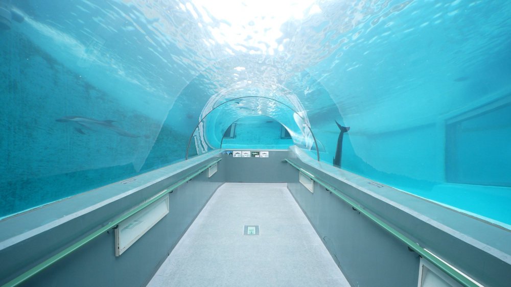 海洋水族館「マリナリュウム」のトンネル水槽には、世界でも極めて珍しい「アルビノのバンドウイルカ」が飼育されています。