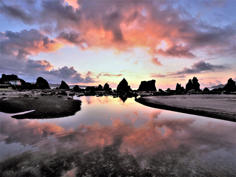 橋杭岩(はしぐいいわ)は、大小さまざまな岩が一直線に並ぶ、串本を代表する景勝地です。その姿がまるで橋の杭を立てたように見えることから、名付けられました。朝日や夕景など、訪れる時間帯によって異なる美しい写真が撮れるスポットとしても人気です。