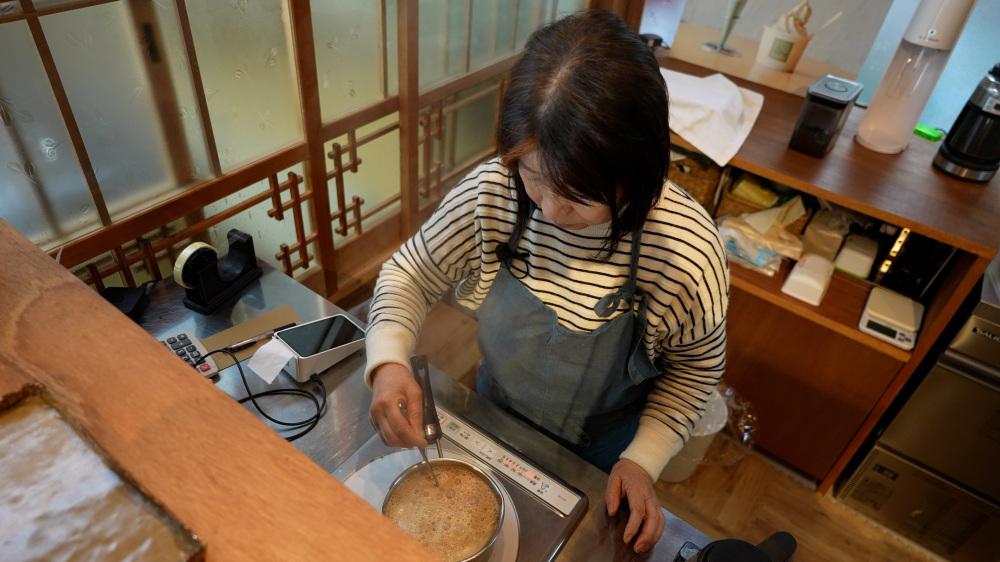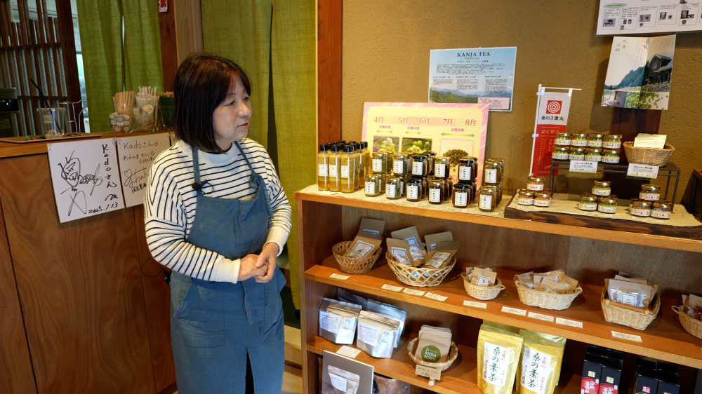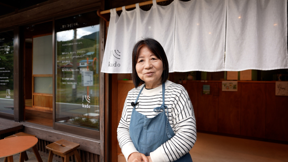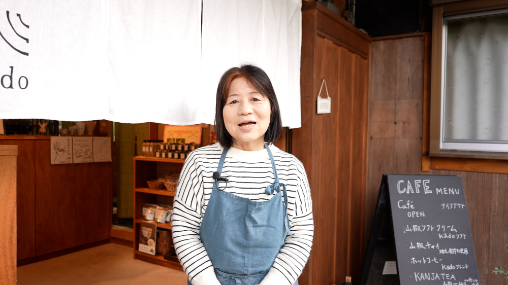 古民家カフェkadoの永岡初美さん。地元特産の『ぶどう山椒』を山椒ソフトクリームや山椒チャイなど、珍しいメニューで提供しています。あらぎ島を訪れる多くの観光客の方に、ぶどう山椒を知ってほしいと、実家をリノベーションしたこちらのカフェ。有田川町をよく知る案内人です。