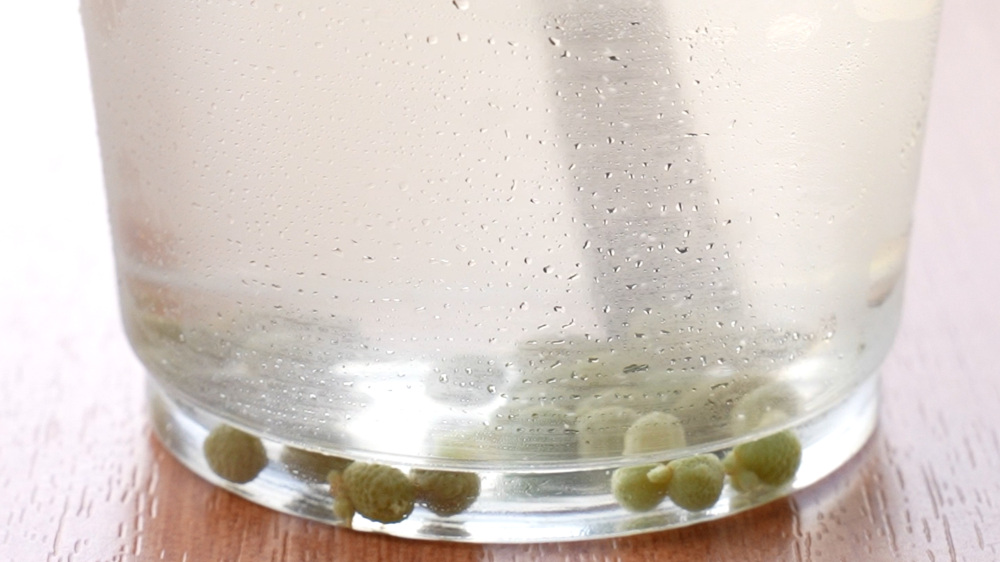 山椒シロップを炭酸で割った山椒スカッシュ。「山椒の実を漬けたシロップが入って少し甘さがある中で、底に留まっている山椒を噛むと、より一層、山椒の爽やかさが楽しめます。」