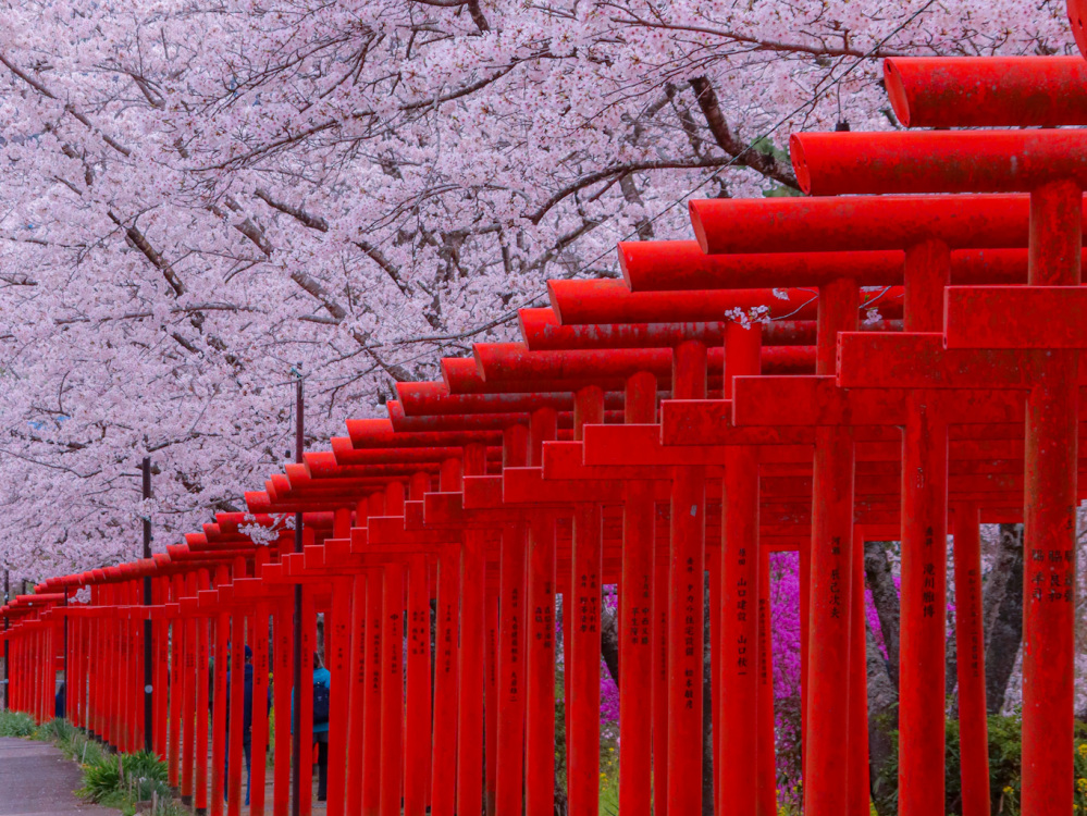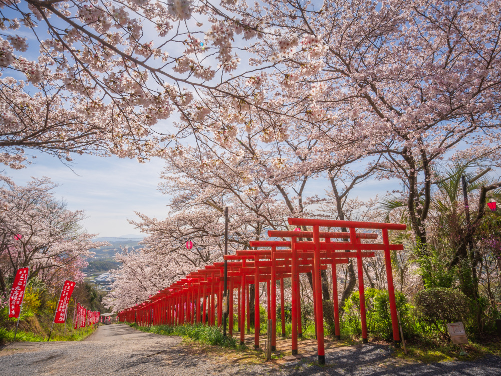 橋本市にある「丸高稲荷神社」は、春になると約150本の桜が咲き乱れ、87基の幾重にも重なる朱色の鳥居との対比はとても幻想的です。