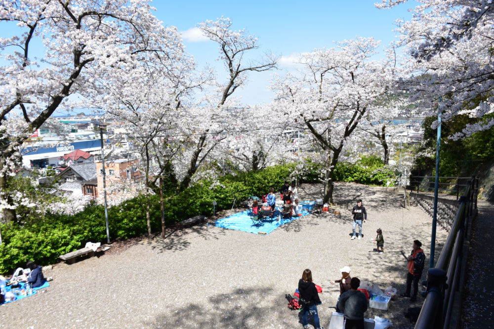 山上からは有田川口、浦の初島(地ノ島、沖の島)及び紀伊水道を隔てて、四国の山陰を望むことができる「ウエノ公園」。春の桜のシーズンには大勢の花見客で賑わいます。