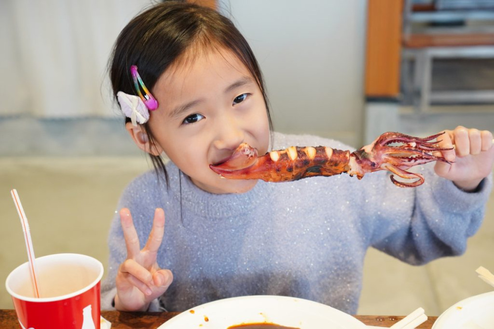 普段はあまりイカを食べようとしない娘ですが、この日は丸ごとのイカ焼きを「おいしい!」とガブリ!