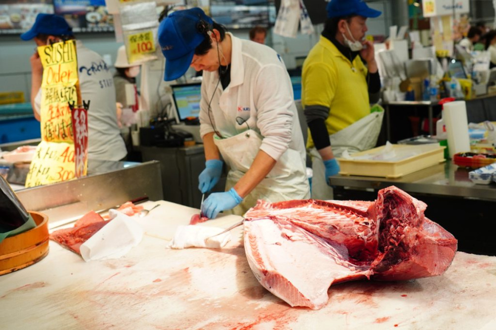 市場コーナーの目玉は、マグロの解体ショー。寿司ネタではマグロをよく頼む娘、間近で見るマグロの大きさ、包丁さばきに「これがお寿司になるんだね」と釘付けでした!