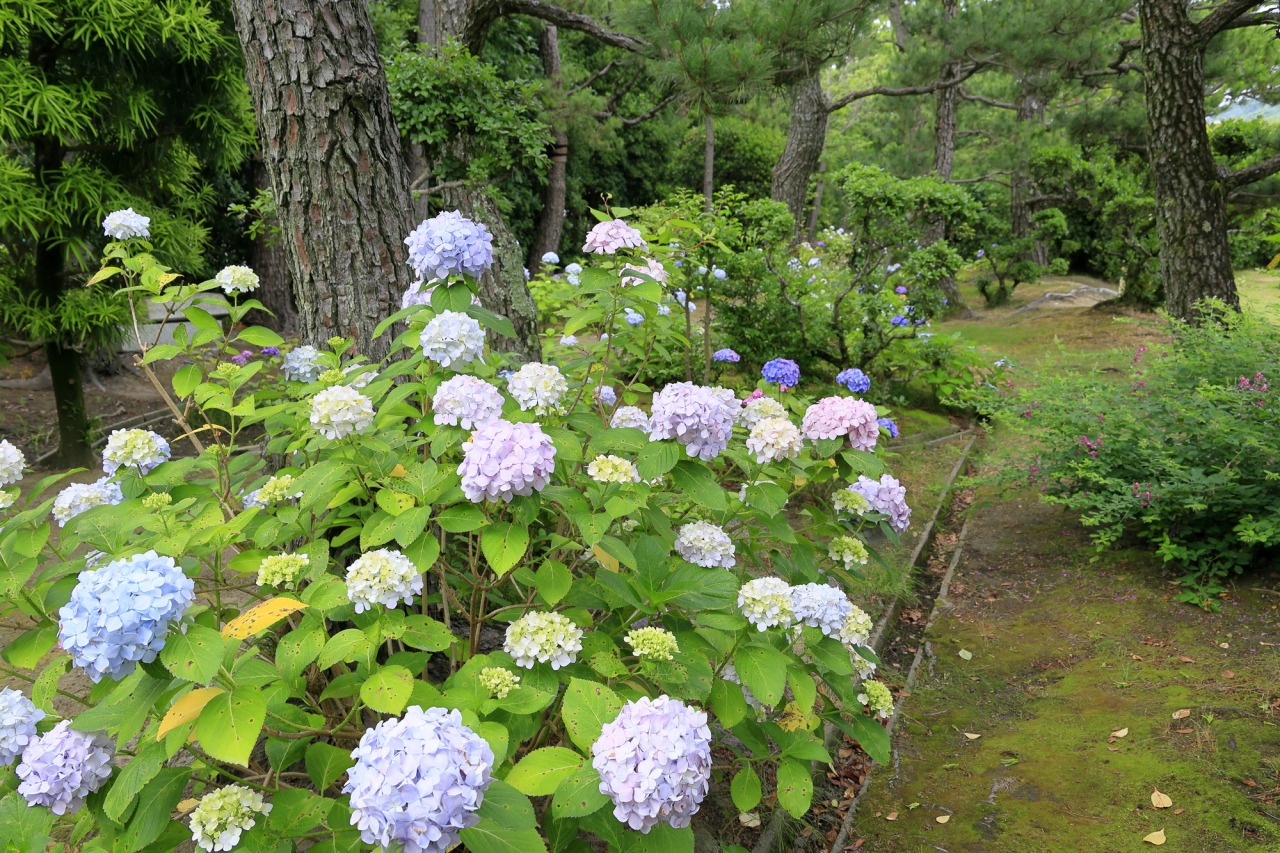 紀州徳川家第十代藩主徳川治宝により造営された大名庭園。約33,000平方mにおよぶ広大な敷地を誇ります。庭園は、松を主体とし、海水が引き入れられた汐入りの池があるなど珍しい特徴を持っています。園内には御茶屋、養翠亭があり、左斜め登り御廊下や茶室・実際庵(二畳台目)など貴重な遺構が保存されています。庭園は四季折々の木々や花々で彩られ、訪れる人々を楽しませてくれます。春には桜やカキツバタ、ツツジ、夏にはガクアジサイやヤマアジサイが美しく咲き誇ります。「あじさい小路」の散策を楽しめるのもこの季節です。秋になると、ハギ・ススキ・ツワブキ・ハゼなどが咲き、色づく木々と秋の訪れを感じることができます。冬は、凛とした空気の中、特に澄んだ潮入りの池を楽しめる季節です。