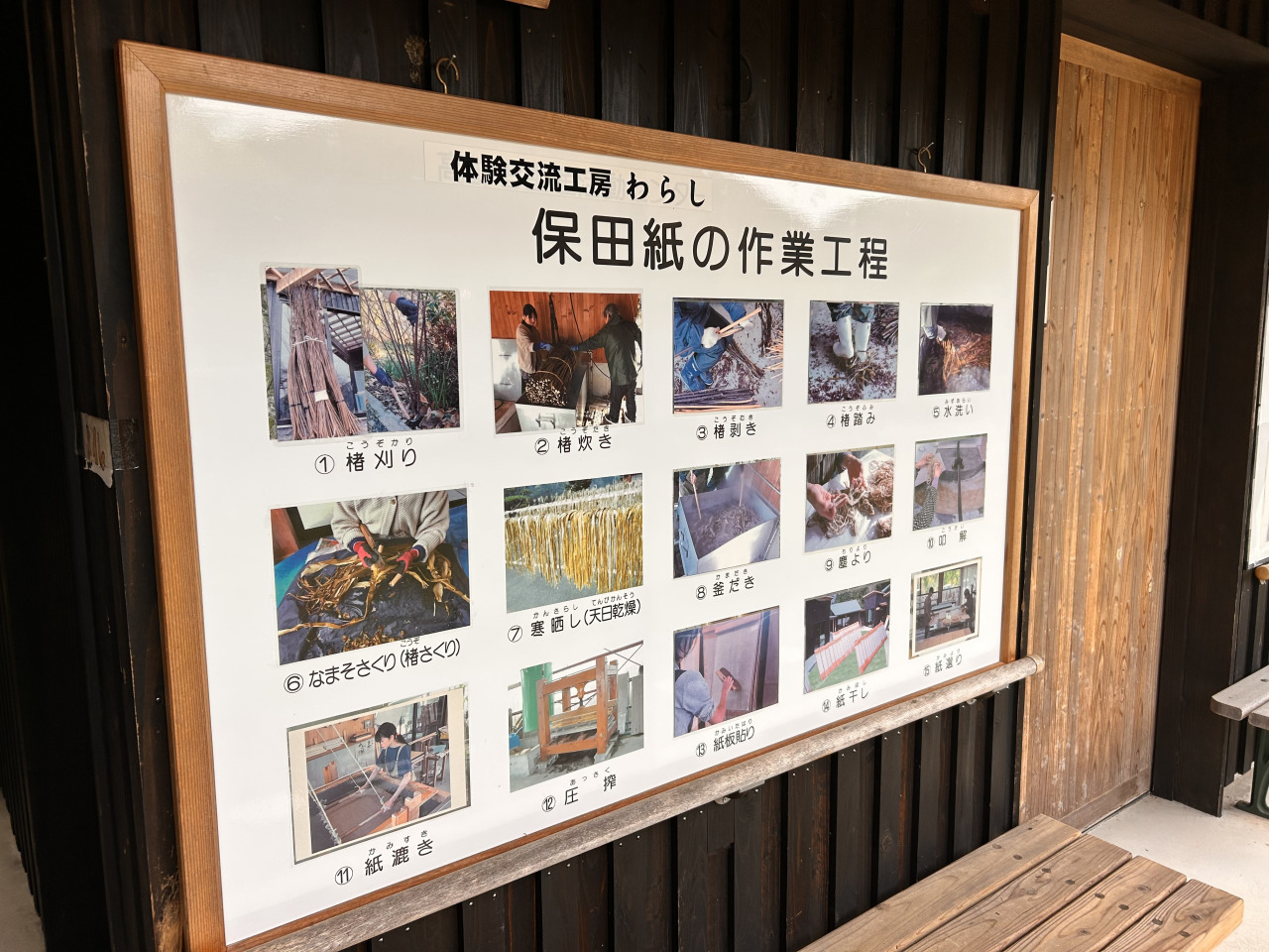 保田紙の製造は、熟練した技術と経験を必要とする、時間と手間のかかる工程です。現在でも、ほとんどの作業は手作業で行われています。主な原料は、1月に収穫される楮(こうぞ)の樹皮です。樹皮は剥ぎ取られ、洗浄され、冬の風にさらされ、煮沸され、きれいに取り除かれた後、水で叩かれて柔らかくなり、繊維が分離します。その後、繊維をネリ(トロロアオイの根から抽出した粘性のある物質)と一緒に水に入れます。湿度や気温に合わせて異なる量の糊が使用されますが、その比率は完全に経験と感覚によって決定されます。木枠に張った和紙をスラリーの中にくぐらせ、パルプが均一に広がるまで揺すります。その後、余分な水分を除去するためにプレスし、丹念に木製の乾燥板にブラシで刷り込みます。ブラッシングが強すぎると紙が破れてしまい、ブラシが不十分だと紙が板にしっかりと接着せず、天日干ししたときに縮んでしまいます。